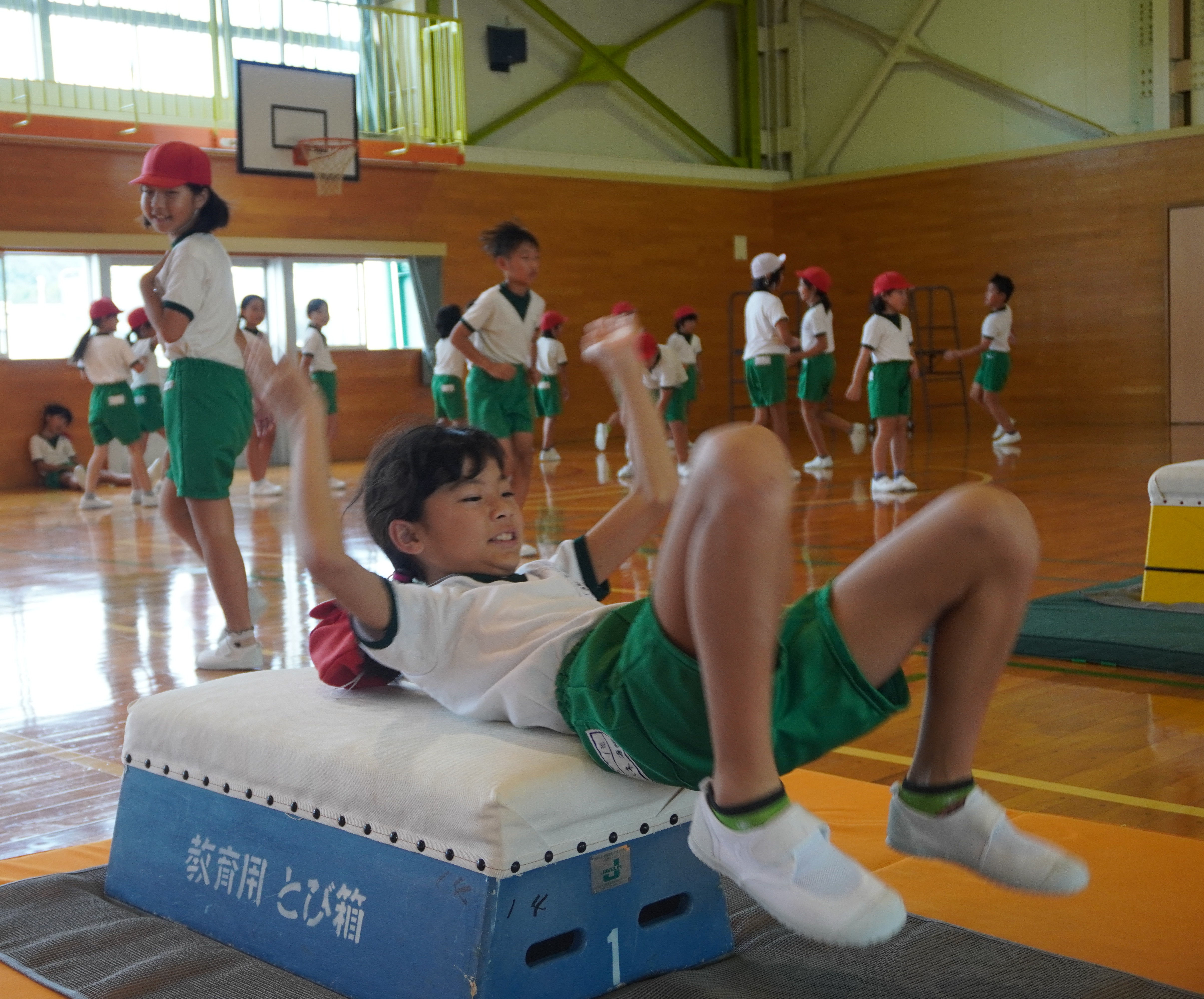 狭い跳び箱の上で、自分の体を操作するのは、難しいことです。